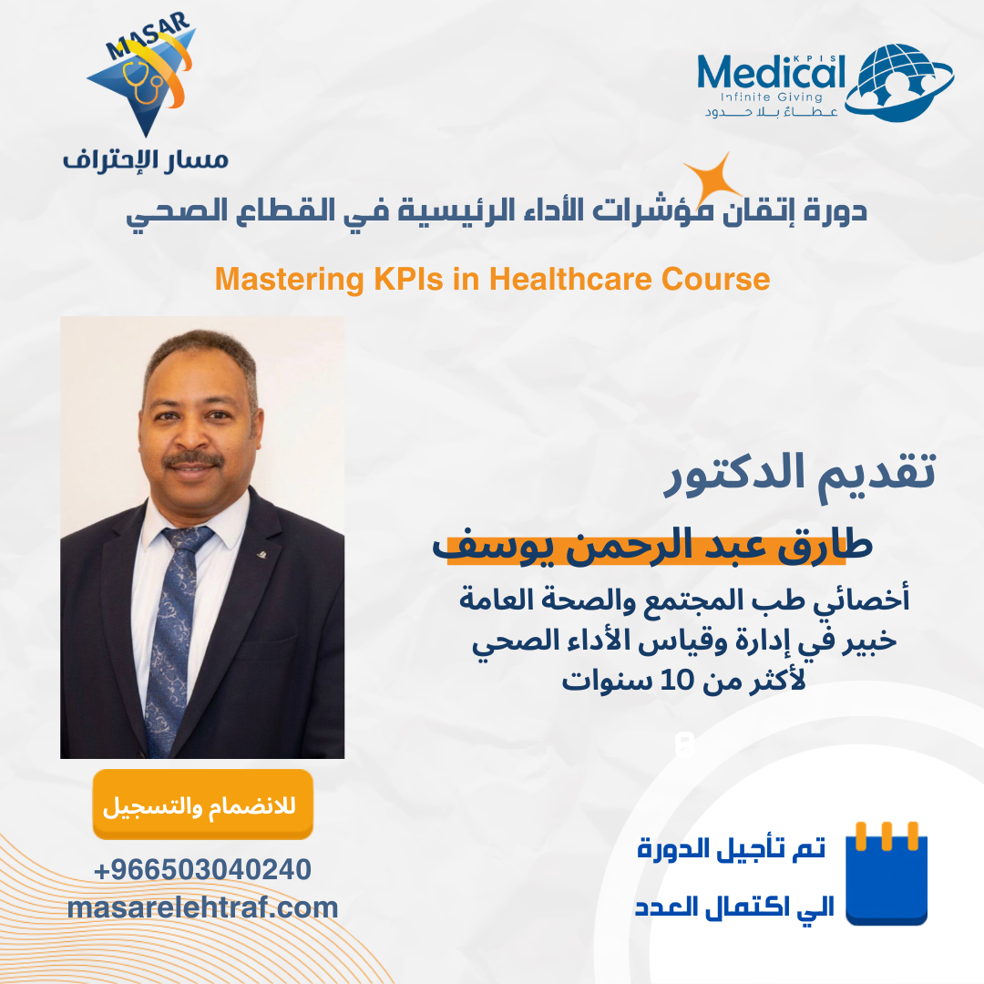 انطلاقًا من دور مسار الاحتراف الصحي في دعم الجودة والتميّز المؤسسي، نقدّم لكم دورة احترافية متخصصة تهدف إلى تمكين العاملين في القطاع الصحي من فهم وتطبيق مؤشرات الأداء الرئيسية (KPIs) وربطها بالأهداف الاستراتيجية وجودة الرعاية الصحية، مع تركيز قوي على التطبيق العملي ودراسات الحالة الواقعية.